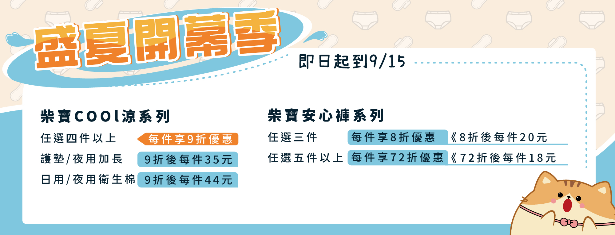 柴寶Cool涼系列 任選四件以上,每件享9折優惠 護墊/夜用加長 9折後每件為 35元 (原價99元) 日用/夜用 9折後每件為 49元 (原價129元) 經典柴寶雲寵/戀愛柴寶泡泡 任選三件以上,每件享8折優惠;任選五件以上,每件享72折優惠 安心褲8折後每件為 20元 (原價39元) 安心褲72折後每件為 18元 (原價39元) 即日起至9/15舉行 盛夏開幕季 邀請大家一同共襄盛舉!